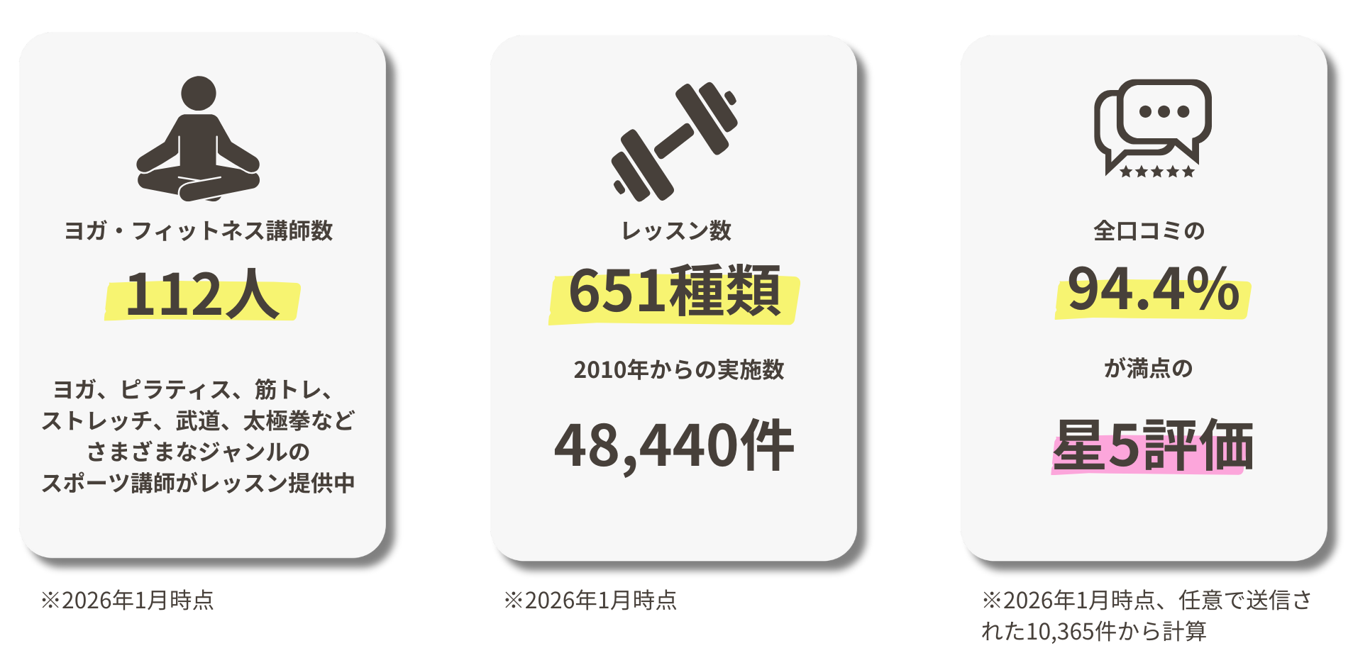 - 「続けられるか不安」を解消する最大3回無料体験 当選者に2枚、口コミ投稿でさらに1枚の無料チケットをプレゼント。計3回の受講機会を提供することで、自分にぴったりのインストラクターやヨガのスタイルをじっくり見極めることができます。