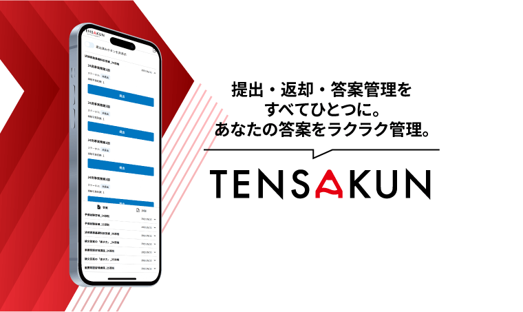 オンライン添削サービスTENSAKUN作成した答案が合格水準に達しているものか否かというのはなかなか自分自身では評価ができません。オンライン添削サービス「TENSAKUN」では試験合格者が一つひとつ答案を確認、コメント等でしっかりとフィードバックするため、自分の答案を客観視することができます。オンラインで提出、返却が完了するので郵送の手間なく添削を受けられます!