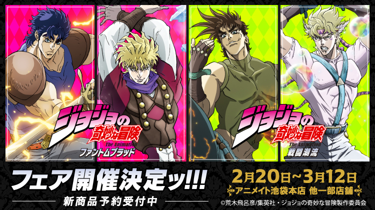 アニメ『スティール・ボール・ラン ジョジョの奇妙な冒険』の配信開始に先駆け、ファントムブラッド、戦闘潮流の描き下ろし商品がアニメイトで2月20日発売! さらに、特典がもらえるフェアも開催!! -