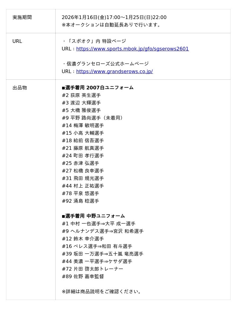 株式会社モバオク(本社:東京都渋谷区、代表取締役社長:小一原 宏樹、以下モバオク)がエンゲート株式会社(本社:東京都中央区、代表取締役:城戸 幸一郎、以下エンゲート)と業務提携し提供するスポーツチーム公式オークションサービス「スポオク」にて、プロ野球独立リーグ・ベースボール・チャレンジ・リーグ(ルートインBCリーグ)所属の信濃グランセローズは2026年1月16日(金)より『信濃グランセローズ20周年記念 リアルお宝 初代ユニフォームオークション』を開始します。