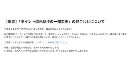 楽天ペイメントは、スマートフォン(スマホ)決済サービス「楽天ペイ」のチャージ払いについて、3月1日からポイント還元プログラムの達成条件と還元率を変更すると発表していたが、準備の都合のため、当面実施を見合わせると改めて発表した。