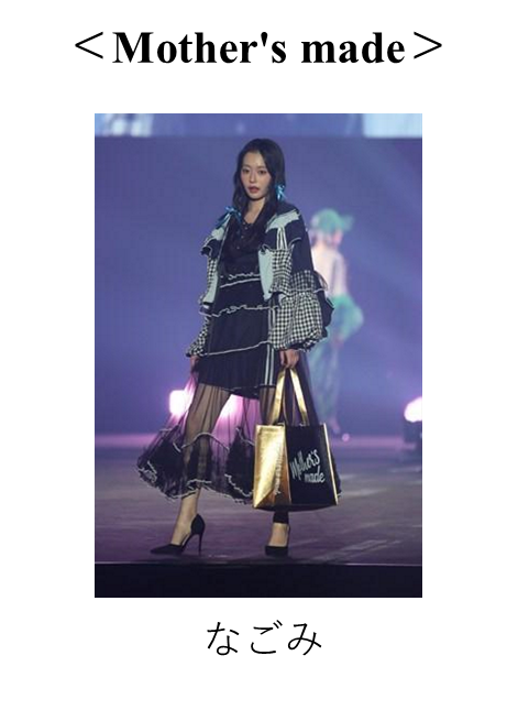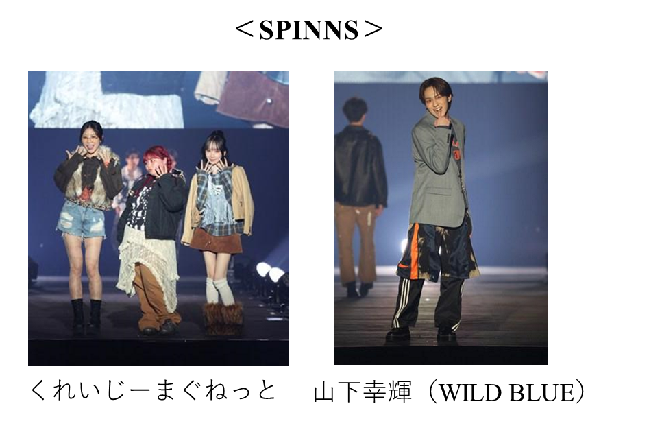 2023年に30周年を迎えたティーンに大人気のブランドで、これまでの知識や実績を活かし、回収した古着や製造過程で発生してしまうサンプル品をアップサイクルするワークショップイベントの開催などをはじめ、持続可能な世の中になるために様々な取り組みをしているSPINNS(スピンズ)は、古着、リメイク、NEW(新品)の商品をミックスした、SPINNSらしい派手でトレンド感のあるスタイリングで展開。くれいじーまぐねっとのエアが着用したデニムジャケットやUraNのフード付きデニムジャケット、WILD BLUEの山下幸輝が着用したハーフパンツなどのリメイクアイテムがスタイリングに組み込まれました。さらに、前回のTGCしずおかに続き、着物や古着をデザインとリメイクの力で唯一無二の洋服に生まれ変わらせるハイパージャパンリメイクブランドMother's made(マザーズメイド)が登場。『Adventures in Wonderland』不思議の国の冒険をテーマに新しい冒険の始まりのような、ワクワクするカラフルなスタイリングで、なごみらがランウェイウォークしました。