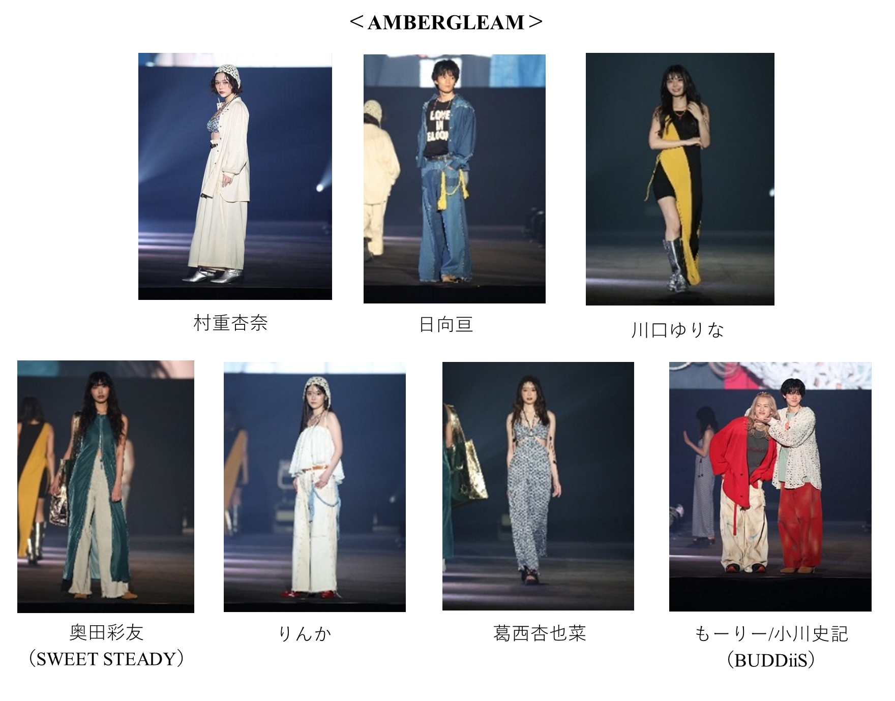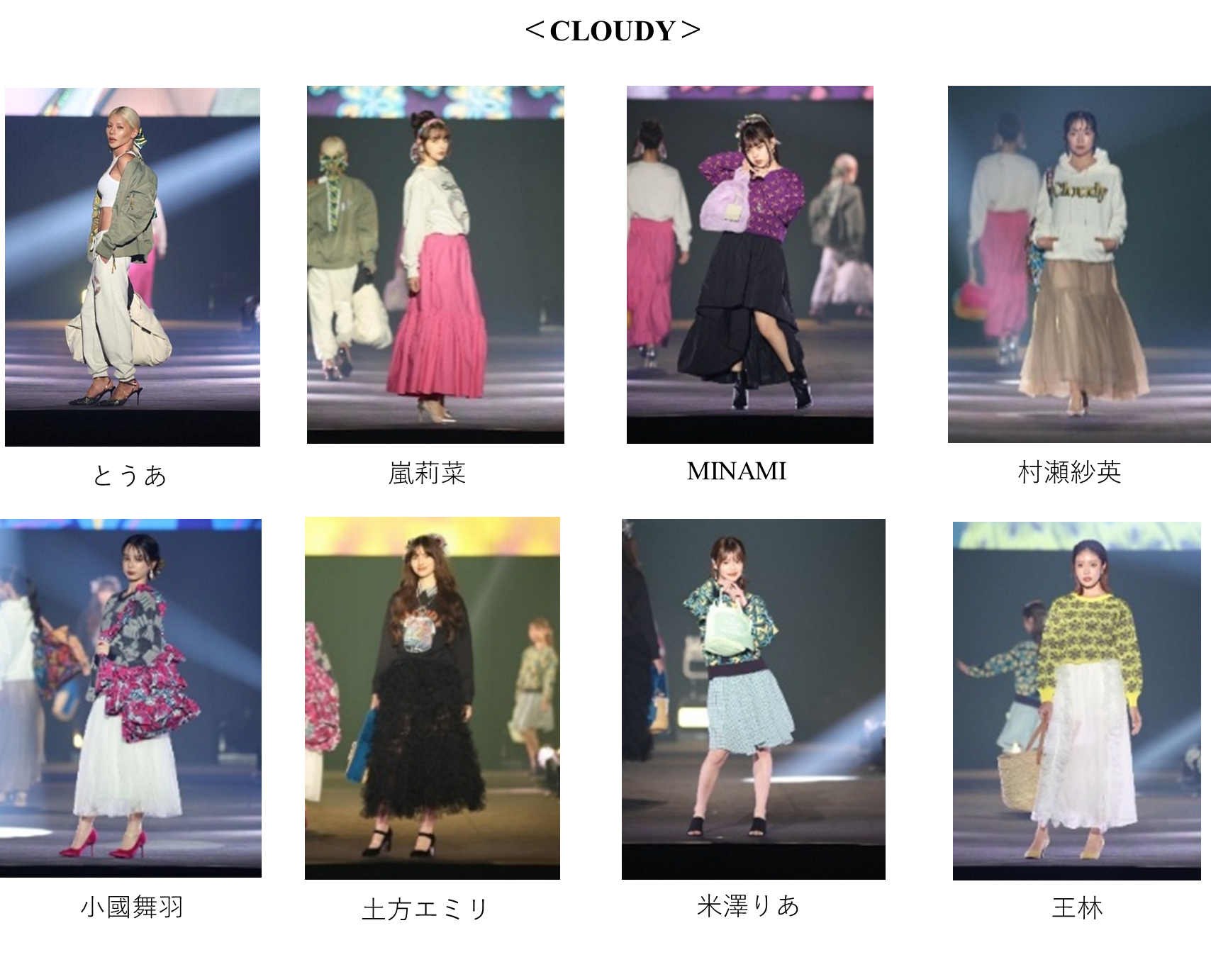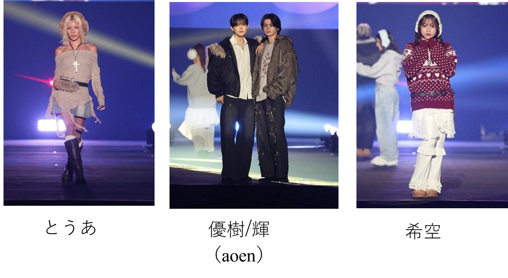 “ジェンダーレス”かつ“エイジレス”を軸に、誰もが自由に楽しめるアイテムを展開し、家族やパートナーとシェアできるスタイルを提案するブランド AMBERGLEAM(アンバーグリーム)。プレッピー、グランジ、ヒッピーといった要素が交差する自由なスタイリングで、まずは村重杏奈。そして、もーりー(BUDDiiS)と、小川史記(BUDDiiS)が初ペアウォーク! ランウェイトップでは小川史記の手にもーりーが顎のせ!ほほえましいポーズで場内を盛り上げました。続いては、“ファッションを通じて社会課題を解決し、アフリカに雇用と教育の機会を創出する”ことをコンセプトに活動するブランド CLOUDY(クラウディ) のステージ。全体テーマは「Warmth in Circulation(循環するあたたかさ)」。CLOUDYのクリエイターが描いたテキスタイルの柄アイテムやアフリカ・ガーナのクリエイティブチームにより制作されたオリジナル映像、さらにファー、ニット、スウェットなどの異素材をミックスしたスタイリングで、季節を超えて「やさしさ」や「ぬくもり」が世界を包み込む様子を表現しました。さらに、静岡デザイン専門学校とのコラボレーション企画として、学生がCLOUDYの残布を使用し、ヘッドピース制作に挑戦。プロのクリエイターによる一部アップデートを経て、完成した作品がどのようにヘアスタイリングとして昇華されるのかに注目が集まりました。ファッションを通じた次世代育成とサステナブルなものづくりを推進する本企画は、CLOUDYならではの想いを体現しています。そんな想いを纏い、Z世代から圧倒的な支持を集めるとうあらがランウェイに登場しました。