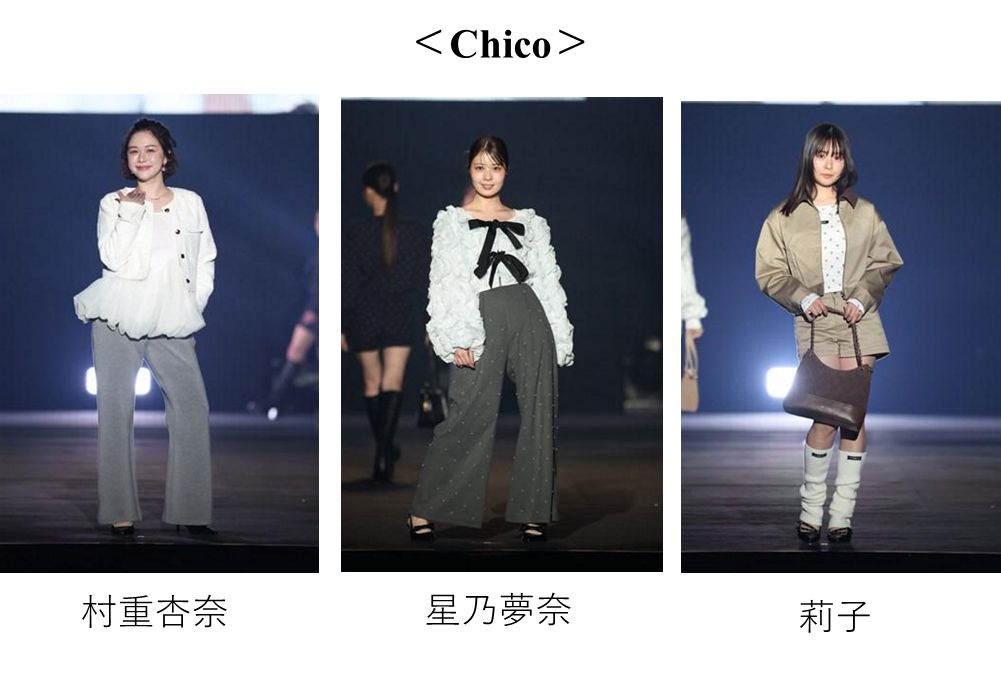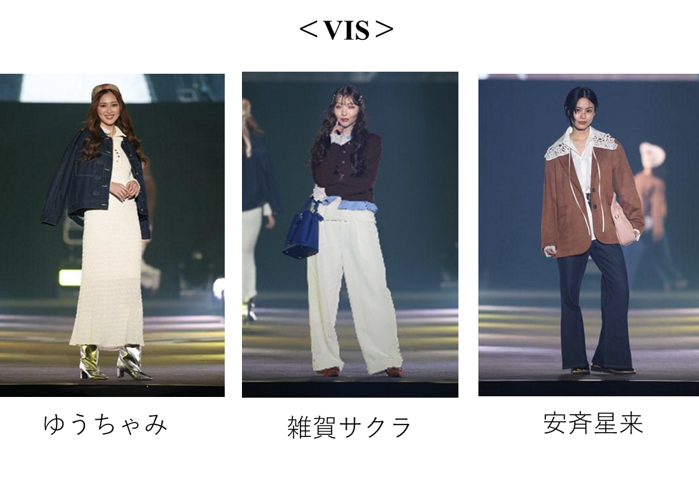 TGC初登場となるカジュアルブランドChico(チコ)は、ヴィンテージウェアテイストをルーツに、潜在的な女性らしさや自分らしさを引き出すスタイルを提案。春を感じる演出のもと、ChicoとSALON by Chicoの2軸で軽やかなスタイリングを身に纏った村重杏奈、星乃夢奈、莉子らが登場しました。さらに、“cheer up LADY”をコンセプトに、気分が上がる、女度が上がる、“高感度”なアイテムで作る“好感度”なスタイリングを提案するブランドVIS(ビス)が登場。ゆうちゃみや雑賀サクラ、安斉星来が、レースやデニム、ブラウン系の春らしいアイテムを取り入れた、上品でモダンフェミニンなスタイリングを披露しました。