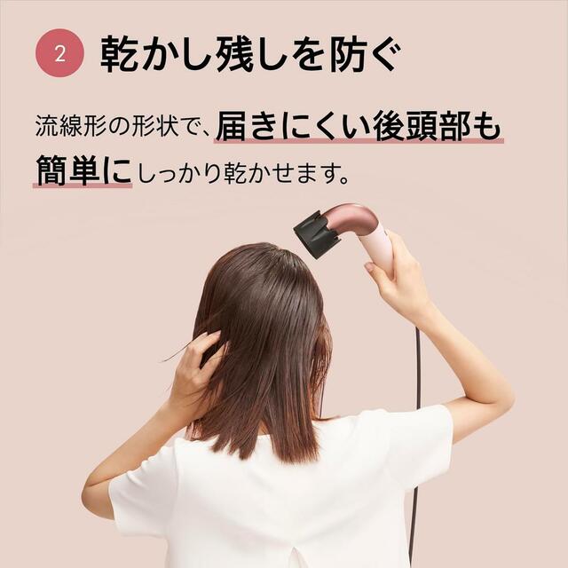 人間工学に基づいたコンパクト設計により、後頭部など届きにくい部位にも風を正確にコントロール。新開発の流線形ヒーターは、小型・軽量でありながら電力密度が高く、曲線を通過する気流を均等に加熱。これにより、丁寧に髪を扱いながら速乾を可能に、ドライとスタイリングを同時に行えます。