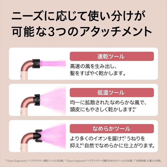 オート設定アタッチメントは、装着したツールを瞬時に認識し、推奨の風速・風温へ自動調整。速乾ツール、低温ツール、なめらかツールそれぞれの特性を最大限に引き出します。