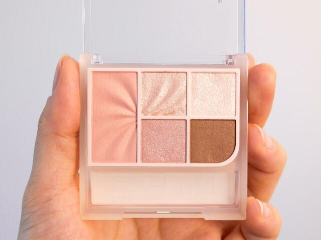 配置は左から時計回りに、チークカラー、ハイライト、ラメシャドウ、マットシャドウ、パールシャドウの5つ。