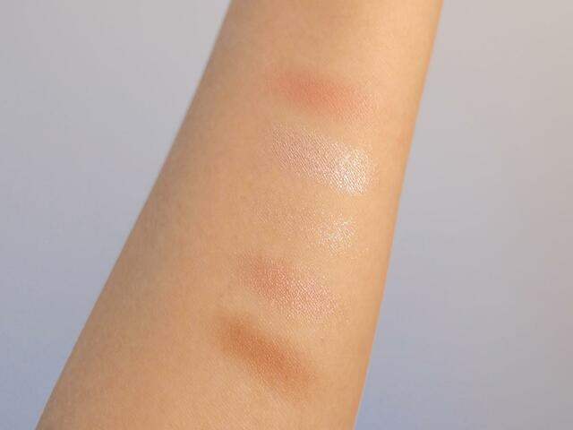 上から、チークカラー、ハイライト、ラメシャドウ、パールシャドウ、マットシャドウ