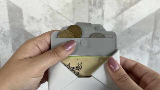 クレジットカードやポイントカードはもちろん、自販機用の小銭や“いざというとき用のお札”まで入ることに驚き。「え、こんなに入るの?」とちょっと感動しました。