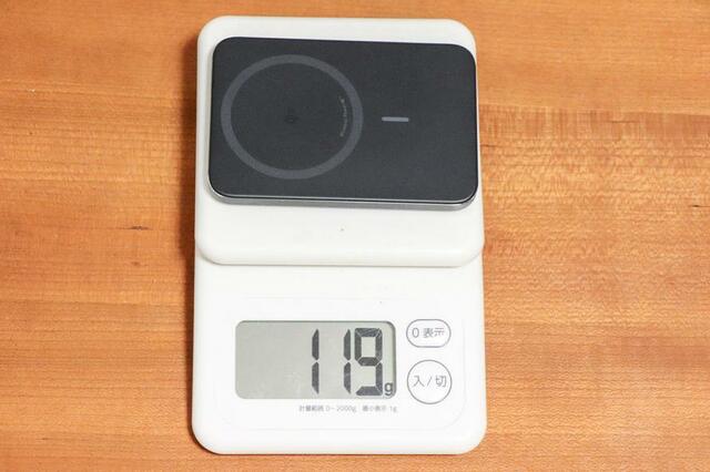 一方で、今回購入したAnker Nano Power Bank (5000mAh, MagGo, Slim)は約119g。