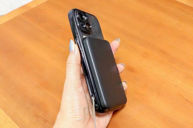 このモバイルバッテリーはQi2充電に対応しているため、背面のマグネットにくっつけるだけで充電可能。