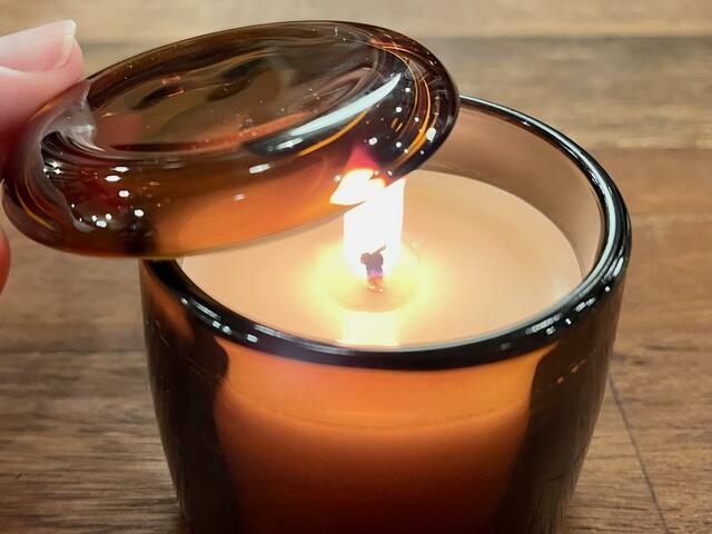 キャンドルは精油をブレンドしてつくられており、ワックスは植物性。蓋をかぶせて消火できるので、消したときの煙の香りが広がりにくい仕様です。