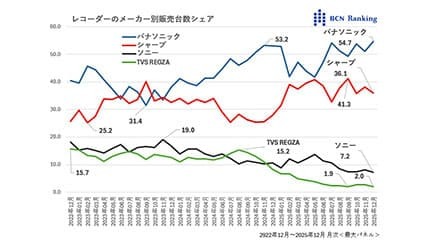 TVS REGZAがBD・HDDレコーダー(レコーダー)市場から撤退した。昨年いっぱいで全てのモデルの生産を終了。現在残っている流通在庫がなくなれば、REGZAのレコーダーは市場から消える。撤退の理由について同社では「主要部品の調達状況やレコーダー市場の状況などを総合的に勘案し決定した」としている。実際「レコーダー市場の状況」は、TVS REGZAはもとより、市場全体でも極めて厳しい。オンラインショップや全国2400の家電量販店などの実売データを集計する、BCNランキングで分析すると明らかだ。 TVS REGZAの販売台数シェアはこの12月、主要4社で最下位の2.0%だった。2024年までは、15%前後のシェアは確保し、3位ソニーと競っていた。しかし、24年一杯で一部製品の生産を終了。以降1桁シェアが続いていた。レコーダー市場からの完全撤退は、一昨年からの既定路線だったのだろう。現在のトップシェアは54.7%のパナソニック。シャープが36.1%で続いている。シャープのレコーダーはパナソニックからOEM供給を受けていると言われており、実質パナソニック系のレコーダーが、市場のほとんどを占めている状況だ。