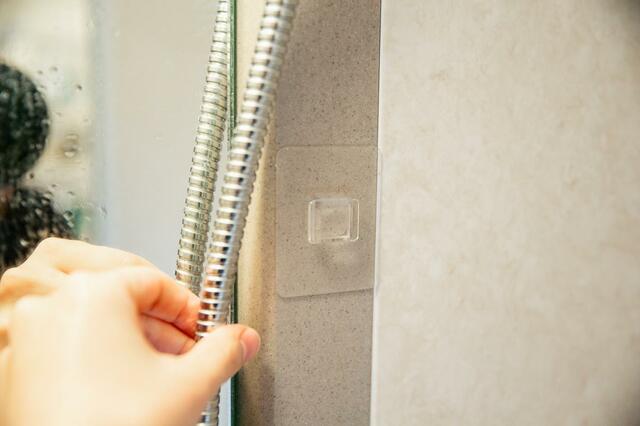 家のいたるところで山崎実業のフィルムフック製品を使っていますが、今のところ一度も外れたことはありません。浴室でも安心して取り付けられそう!