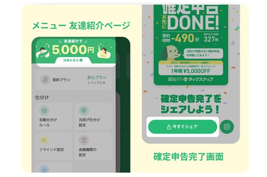 なお、友達紹介を受けた方には、タックスナップ利用料の5,000円割引がプレゼントされます。