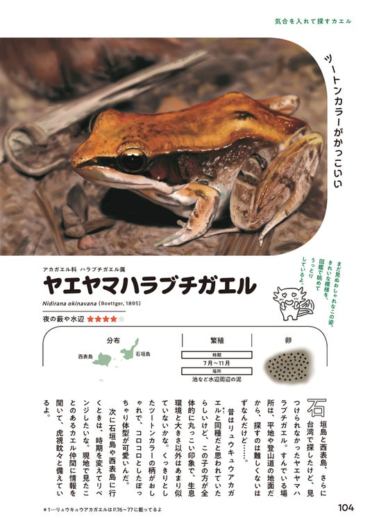 本書は2020年に刊行した同名タイトルの新装版ですが、今回の刊行に際してカバーの下の表紙に特別掲載している、2020-2025年に分類された新種の6種の紹介も必見。最新版『日本のカエル48 偏愛図鑑』を、お近くの書店の〈生きもの・自然科学〉コーナーで、ぜひお手にとってみてください!