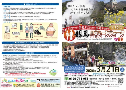 今年も龍馬ハネムーンウォークin霧島が、限定1,300名(霧島温泉湯けむりコース:限定1,000名、龍馬お龍の霧島浪漫街道コース:限定300名)で開催されます。