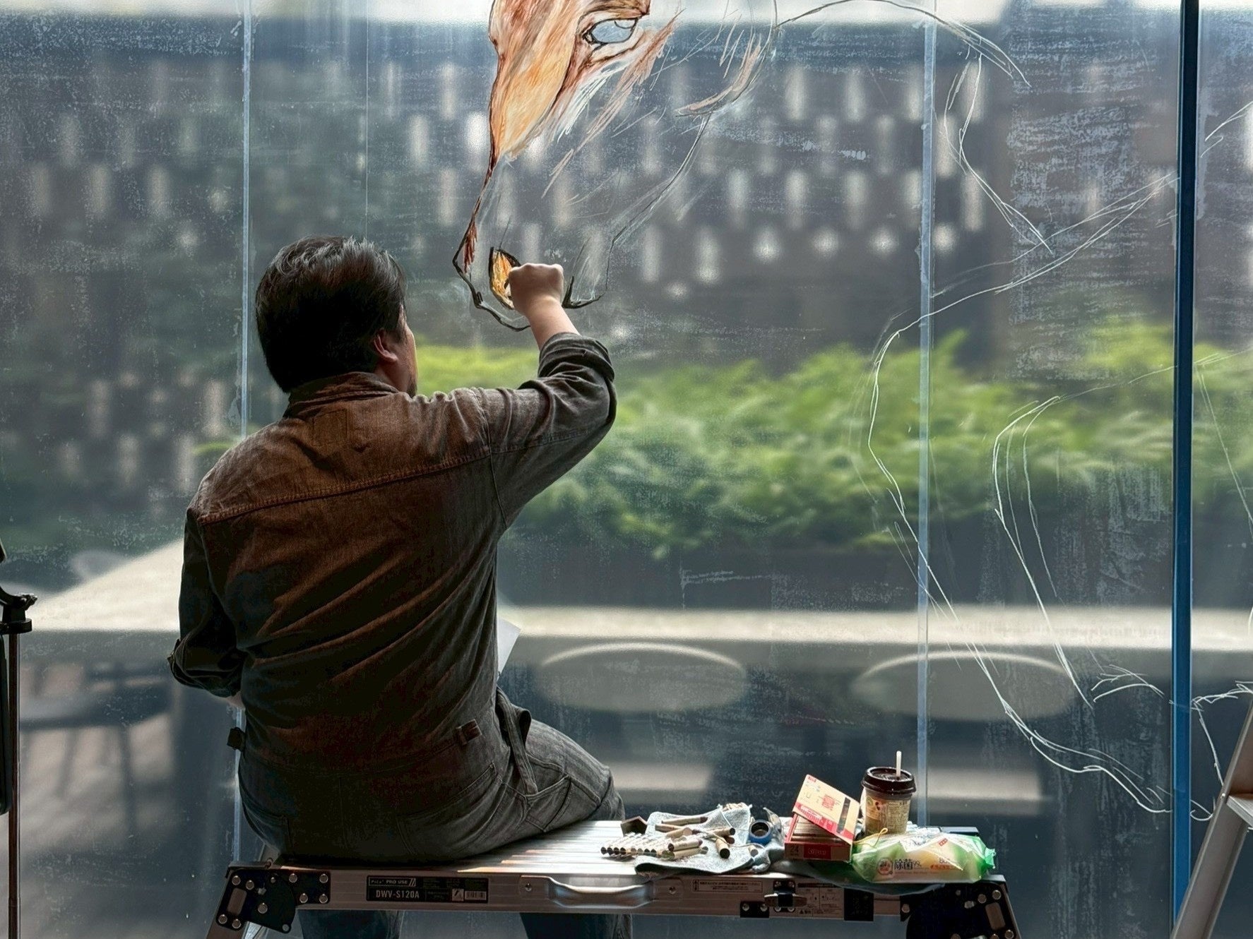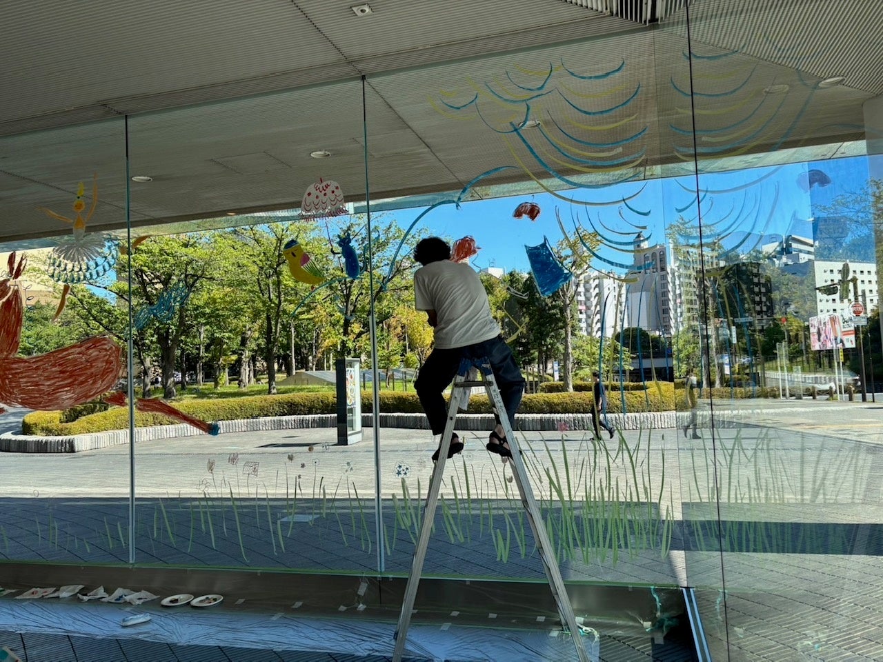 「大きな窓ガラスへのアート制作は、外側からも内側からも透明なガラスに描く様子を見ることができ、通行する一般の方や、滞在する利用客がアーティストと交流できるなどの特別な経験ができる場にもなり、制作過程のライブペインティング自体がコミュニケーションツールになります。