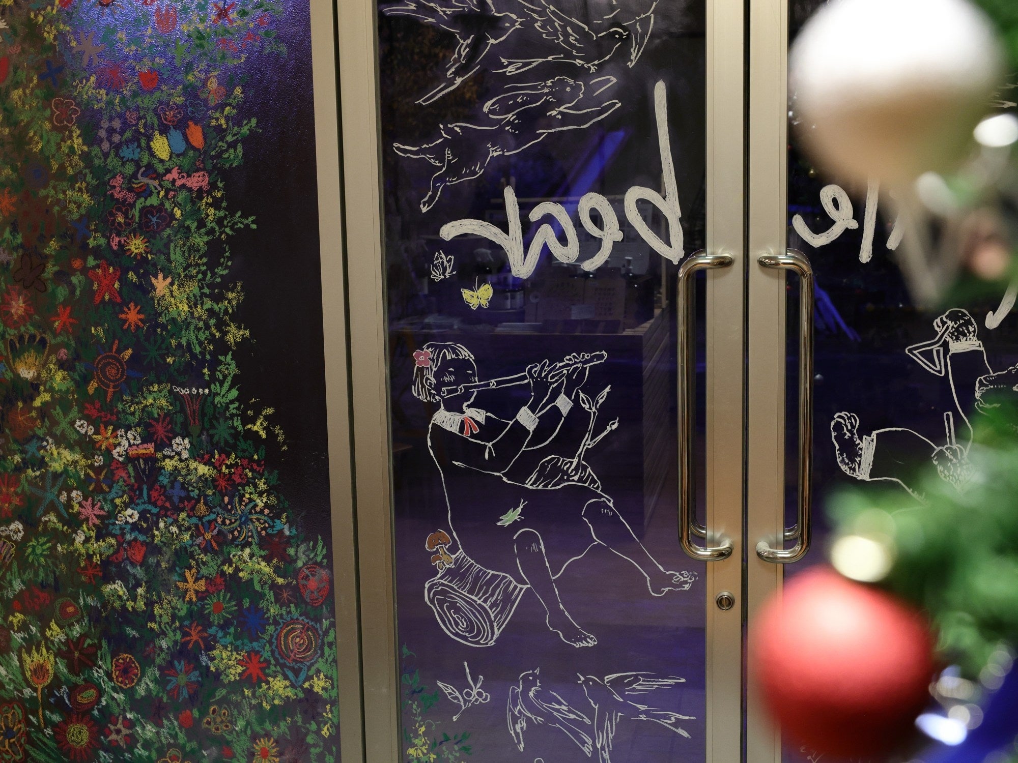 施設や店舗にある窓ガラスを、水拭きで消える魔法の筆記具『キットパス』で巨大なキャンパスに変貌させる空間演出です。光や風を取り込む窓本来の役割以外で普段あまり活用しないデッドスペースを、フォトスポットや集客メディアへと再生し、施設の価値を最大化します。