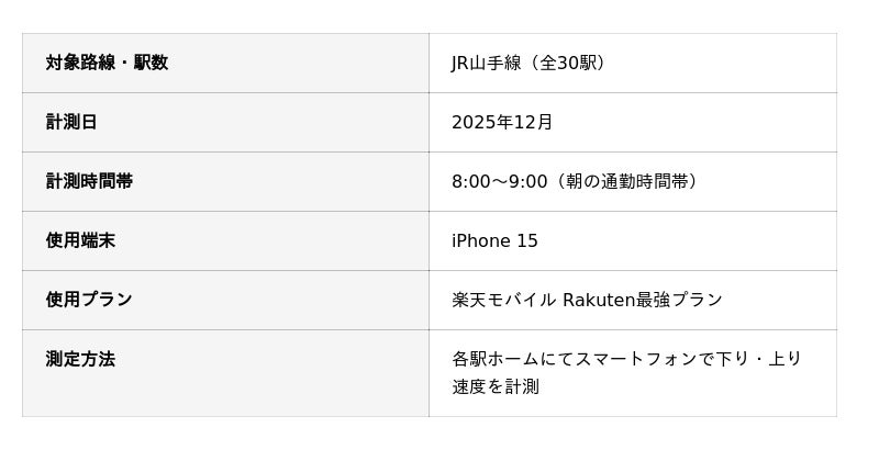 本調査は、朝の通勤ラッシュ時に楽天モバイルが実際にどの程度使えるのか、駅構造・混雑度が通信品質に与える影響を検証することを目的としています。