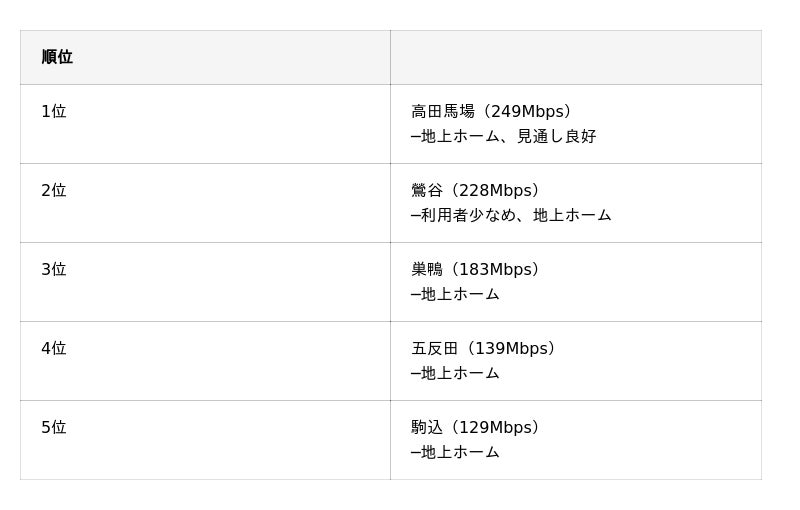 上位5駅はすべて100Mbps超で、4K動画のストリーミング(推奨25Mbps)も余裕でこなせる速度でした。