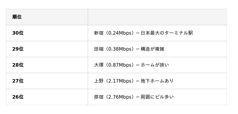結論:下り速度で低速だった下位5駅には新宿・上野など主要ターミナル駅が含まれ、1Mbps以下の駅も3つあった