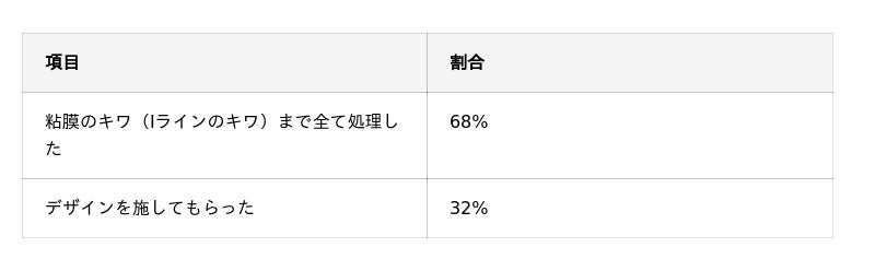 脱毛時の処理範囲については、「粘膜のキワ(Iラインのキワ)まで全て処理した」と答えた人が68%を占めました。一方で、「デザインを施してもらった」と回答した人は32%にとどまっており、あらかじめデザインを決めて施術を受けている人は多くないことが分かります。