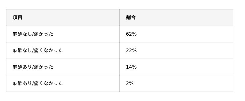 - 痛みについては「麻酔なし/痛かった」と回答した人が62%