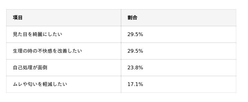 施術前の悩みとしては、「見た目を綺麗にしたい」(29.5%)や「生理の時の不快感を改善したい」(29.5%)、「自己処理が面倒」(23.8%)といった回答が多く挙げられました。これらの結果から、VIO医療脱毛は女性特有の悩みや、日常生活で感じる不便さの解消を目的に施術を受ける方が多いことがうかがえます。