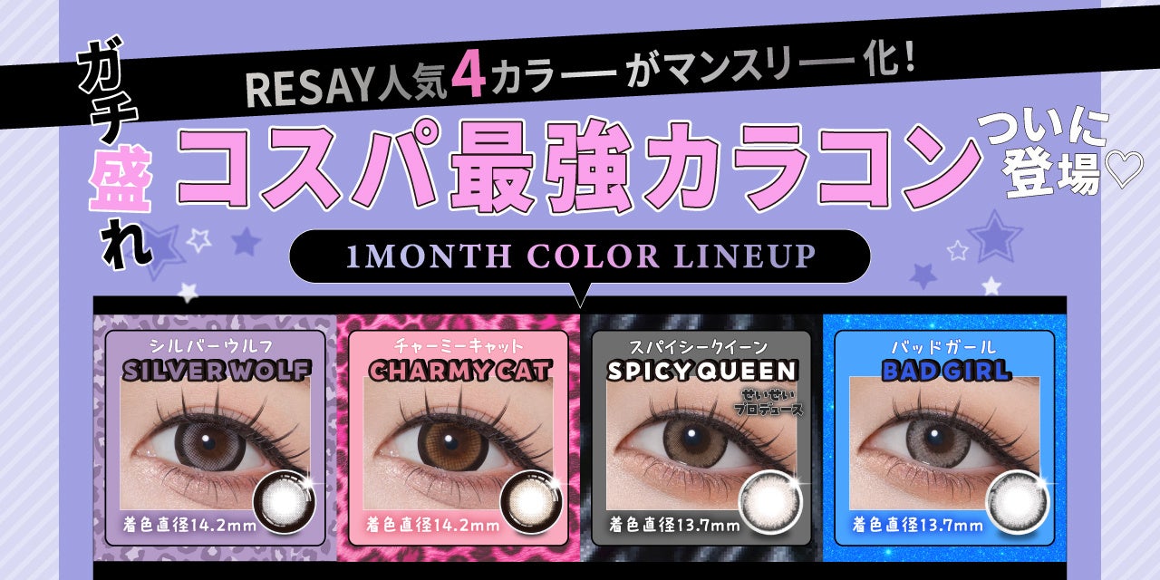 RESAYより1DAY人気カラー『SILVER WOLF(シルバーウルフ)』、『CHARMY CAT(チャーミーキャット)』、『SPICY QUEEN(スパイシークイーン)』、『BAD GIRL(バッドガール)』の4色が1MONTHレンズとして発売いたします。