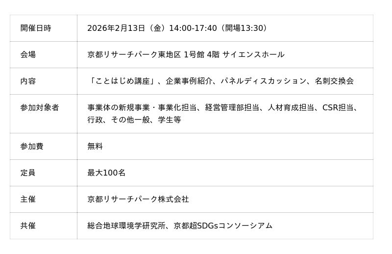 京都リサーチパーク株式会社(本社:京都市下京区、代表取締役社長:浅野貢男、以下、KRP)は、2026年2月13日に2025年度環境フォーラム「Green Tech Wonder」(共催:総合地球環境学研究所、京都超SDGsコンソーシアム)を開催いたします。本フォーラムは、事業規模や業態を問わず、環境・サステナビリティ領域(グリーン分野)へ参入できる契機や道筋を共有することを目的に開催します。事業体の新規事業・事業化担当、経営管理部、人材育成、CSR担当の方だけでなく、行政その他一般、学生等ご関心のある方はぜひご参加ください。