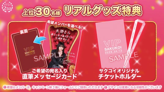 対象期間中に開催される3つのカレシイベントのポイントを合計し、総合ランキングに入賞した上位30名様を、櫻坂46「5th YEAR ANNIVERSARY LIVE」4月12日(日)公演の「サクコイVIPシート」にご招待いたします。