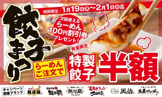 株式会社キタカタ(本社:新潟県新潟市)が運営するらーめんブランド「新潟らーめん 無尽蔵」、「らーめん 風伯」、「生姜らーめん専門店 生姜ワンダー。」などでは、日頃のご愛顧への感謝と家計応援の想いを込めて、2026年1月19日(月)から2月1日(日)までの14日間、「餃子半額まつり」を開催いたします。物価高が続く今だからこそ、家計に優しい外食応援で“おいしい時間”をもっと気軽に楽しんでいただけるよう、サイドメニューの一番人気である『特製餃子(5個)』を半額にて提供いたします。