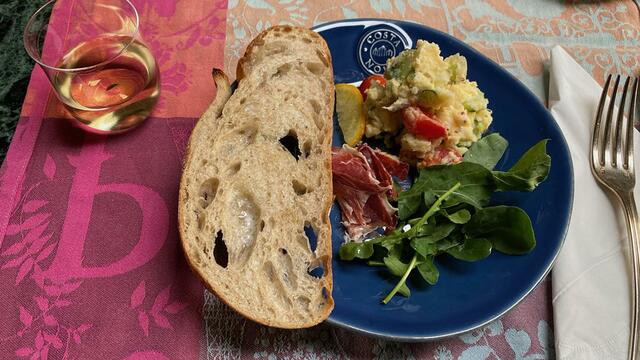 久しぶりのパン(タバティエール)が美味しい。めちゃ美味しい。金柑入りのポテトサラダ、ルッコラとイベリコハム。