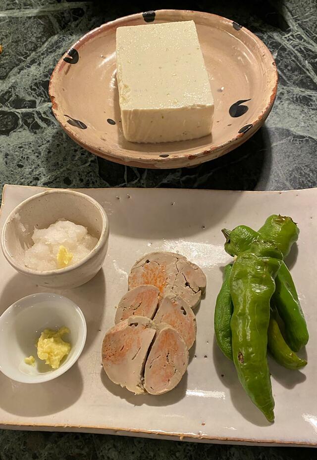 だだちゃ豆腐、あん肝、焼き万願寺。