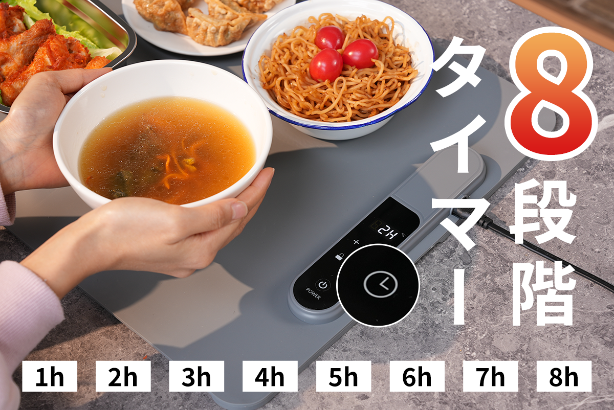 1時間単位で、最大8時間まで設定可能なタイマー。発酵には1-2時間、衣類の乾燥には3-4時間、煮込み料理の保温にはそれ以上など、用途にぴったりの時間をセットすれば、その後の作業は本製品にお任せできます。