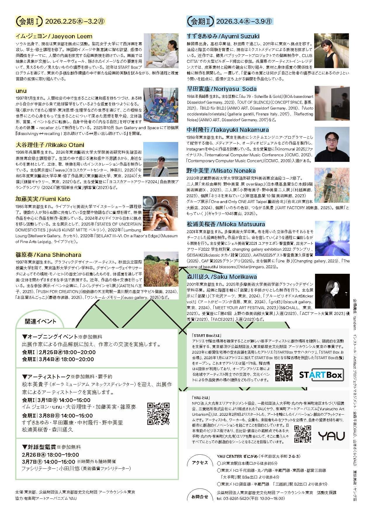 このたび、有楽町アートアーバニズム YAUの協力のもと、 START Boxで活動する11名のアーティストの作品を紹介する「START Box EXHIBITION vol.5」を開催します。作品展示をはじめ、対話型鑑賞やモデレーターを交えた出展作家のアーティストトークを行います。