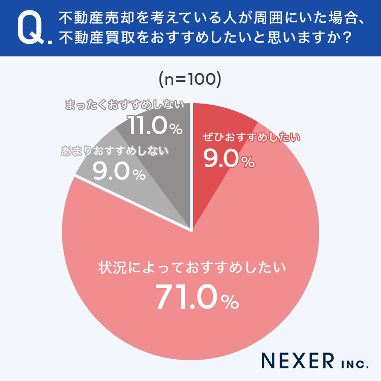 「ぜひおすすめしたい」と回答した人は9%、「状況によっておすすめしたい」と回答した人は71%でした。これらの回答を合わせると、80%もの人が不動産買取を周囲におすすめしたいと考えていることがわかります。