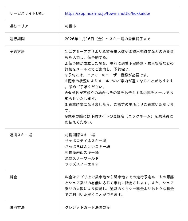 移動の課題に取り組むソーシャルデザインカンパニーの株式会社NearMe(本社:東京都中央区、代表取締役社長:高原幸一郎、以下:ニアミー)と札幌市は、札幌市が推進する「都市型スノーリゾート」の交通課題解決に向けた官民連携事業として、1台のタクシーを目的地の近い複数名で乗車する「シェア乗り」を活用したニアミーのタクシーの実証運行を2026年1月16日(金)より開始しました。