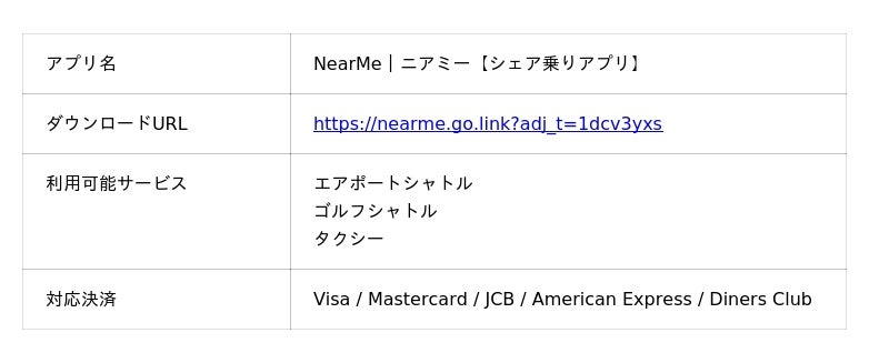 「NearMe」は、独自のAIを活用した最適なルーティングで、出発地から目的地までの移動をドアツードアで結ぶタクシーのシェアサービスです。その中でも、空港とその周辺の都市部を結ぶ空港送迎型の『エアポートシャトル』は、2019年8月のサービス開始から、 多くの方にご利用いただき、累計予約人数125万人※1を達成しました。現在は、全国16の空港※2(羽田空港、成田空港、伊丹空港、関西空港、新千歳空港、中部国際空港、福岡空港、那覇空港、旭川空港、帯広空港、青森空港、仙台空港、静岡空港、南紀白浜空港、徳島空港、北九州空港)と、空港周辺の都市部でご利用いただくことができます。対象エリアであれば、出発地となるご自宅から空港、そして空港から最終目的地まで一気通貫でつながるため、公共交通機関の乗り換えがなくなるなど、ストレスフリーな移動体験を提供することができます。また、貸切送迎サービスや、東京都と千葉県全域のゴルフ場と東京都23区内を結ぶゴルフシャトルなど、シチュエーションに応じて様々な移動のニーズに対応するための各種サービスを展開しています。