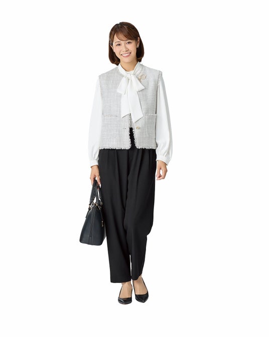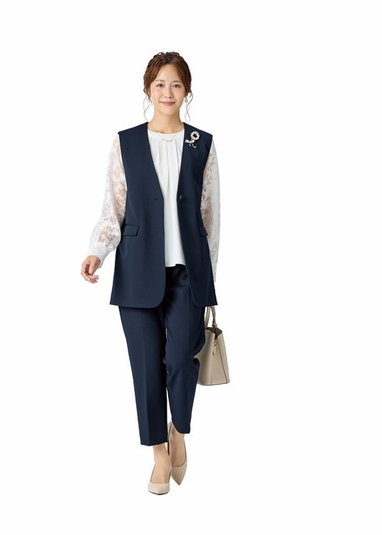 価格:ジャケット/ジレ各本体7,800円(税込8,580円)・ パンツ本体4,980円(税込5,478円)・ブラウス本体3,980円(税込4,378円)