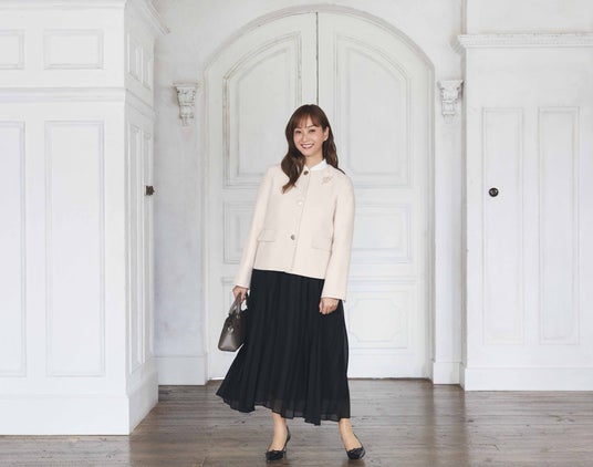 揺れるプリーツスカートが印象的なハレの日スタイル。