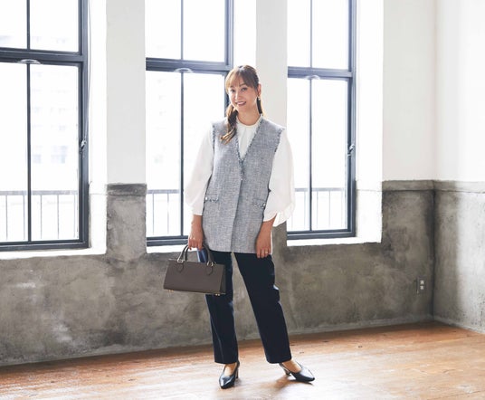 ツイードジレで映えるトレンドスタイル。ブラウスはジレに映えるベルスリーブのデザインです。