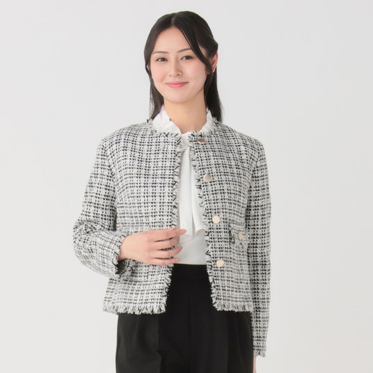 リボンのような衣装糸を使ったファンシーなツイードジャケット。華やかな装いは、特別な日にもお出かけにも最適です。