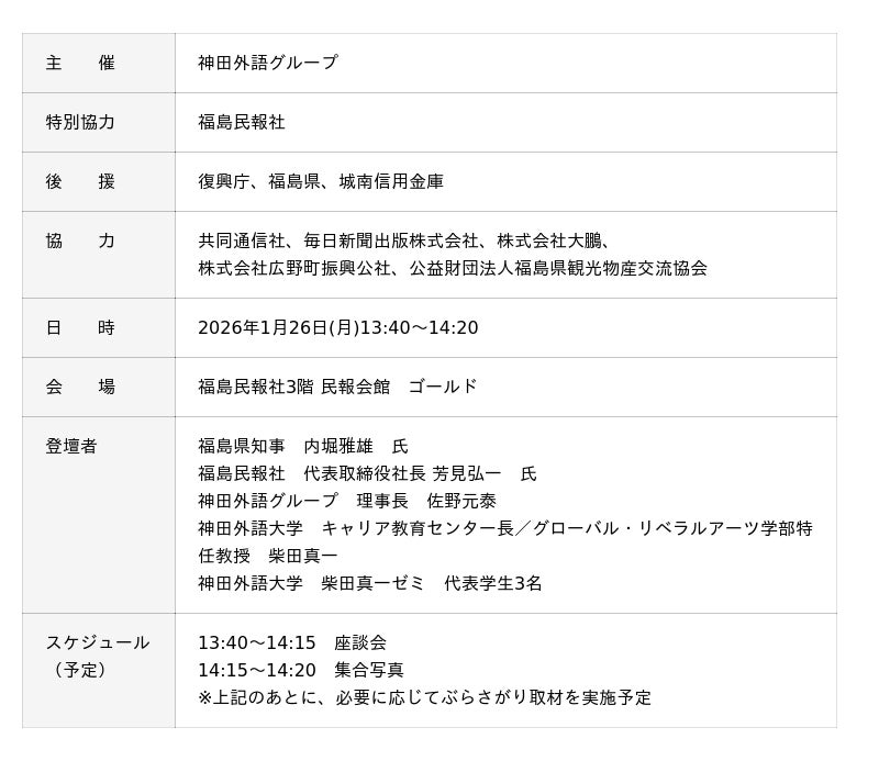 神田外語グループ(東京都千代田区/理事長:佐野元泰)は、東日本大震災・原子力災害から15年の節目にあたり、福島の復興と学生の学びを世界に発信する「震災復興発信プロジェクト」を展開しています。その一環として、グローバル人材の育成を目指す神田外語大学・柴田真一ゼミの学生19名が、福島県浜通り地域での取材をもとに、日英版の震災復興新聞『福島とともに(英題:”Together with Fukushima”)』を完成させました。本新聞の完成と福島県への贈呈を受け、2026年1月26日(月)、福島民報社において、内堀福島県知事と学生を中心とした座談会を開催します。本座談会は、東日本大震災・原子力災害から15年を迎えた今、復興の途上にある福島の姿を学生がどのように捉え、どのような言葉で世界へ伝えていくのかについて、学生と内堀知事を中心に対話を通じて考える場として実施します。