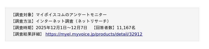 調査結果を掲載・引用いただく場合は、必ず「マイボイスコム調べ」もしくは「マイボイスコム(株)調べ」と表記をお願いいたします。