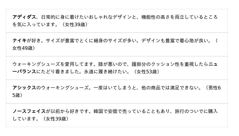女性では「アディダス」「ニューバランス」が同率で上位2位、女性60~70代では「ニューバランス」「ナイキ」が上位2位となっています。