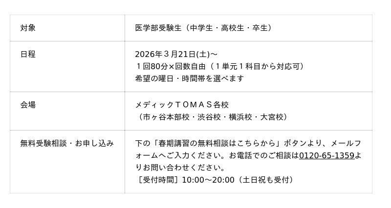 株式会社リソー教育グループ(本社:東京都豊島区、代表取締役:天坊真彦)の子会社である、株式会社TOMAS(本社:東京都豊島区、代表取締役:町田仁)は、2026年3月21日(土)より、医学部受験専門の個別指導塾・予備校「メディックTOMAS」による「医学部受験 完全1対1個別春期講習」を開講いたします。