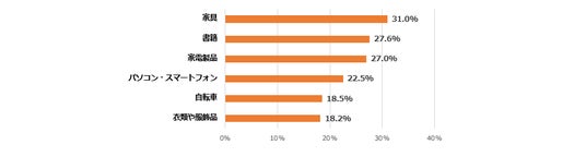 自治体が不用品などを販売しているとしたら、どのようなものを購入したいと思うか複数回答で聞くと、上位は「家具」31.0%、「書籍」27.6%、「家電製品」27.0%、「パソコン・スマートフォン」22.5%、「自転車」18.5%、「衣類や服飾品」18.2%だった。