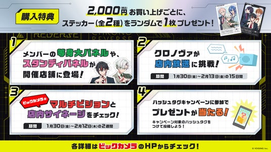 株式会社VOISING(本社:東京都港区、代表者:ないこ)所属の2.5次元アイドルグループ「クロノヴァ」は、株式会社ビックカメラおよび株式会社ソフマップにて、2026年1月30日(金)から2月23日(月)までの期間限定で『クロノヴァグッズフェア in ビックカメラグループ』を開催することが決定いたしました。家電販売店という”身近な場所を舞台に、クロノヴァの世界観を立体的に体感できるコラボレーションをお届けいたします。